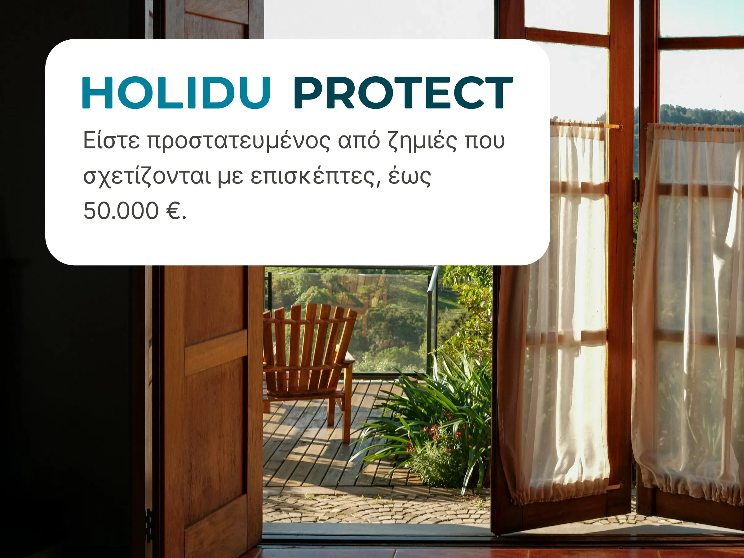 Η χρήση του Holidu για οικοδεσπότες είναι 100% χωρίς ρίσκο. Καταβάλλετε ένα εφάπαξ ποσό ενεργοποίησης και μια προμήθεια ανά κράτηση μόνο εάν ένας επισκέπτης κάνει κράτηση στο κατάλυμά σας.