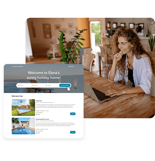 Όλες οι φωτογραφίες, τιμές και λεπτομέρειες μεταφέρονται αυτόματα από τη Holidu. Προσαρμόστε με τα χρώματά σας και ένα μήνυμα καλωσορίσματος – ή προσθέστε το widget κρατήσεων στην υπάρχουσα σελίδα σας. Ασφαλείς πληρωμές και 8 γλώσσες συμπεριλαμβανόμενες.